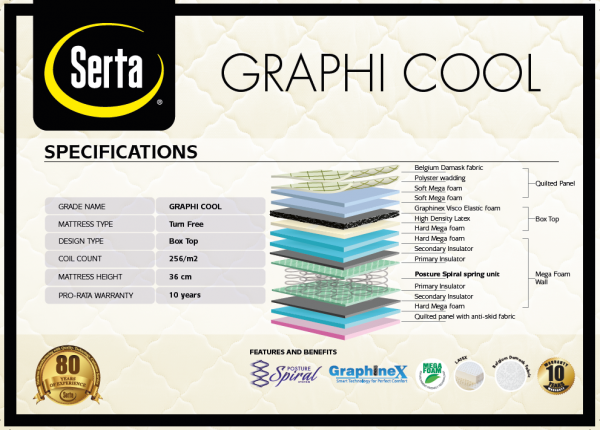 Manufactured using the latest technological innovation: Graphinex ! Graphi cool mattress is equipped with Graphinex infused Visco foam layer and natural latex layer in the top quilting panel to provide ultimate relaxation and comfort. It also has a layer of 60 D Graphinex Visco foam and 30 D mega foam layer apart from several layers of foam and insulation to provide additional comfort and breathability. The patented Posture spiral spring technolgy provides advance pressure relief and better support than a single coil design for a  cooler good night’s sleep.